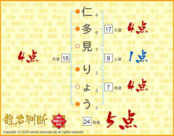 仁(4画)多(6画)見(7画) り(2画)ょ(3画)う(2画)