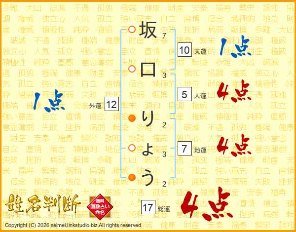 坂(7画)口(3画) り(2画)ょ(3画)う(2画)