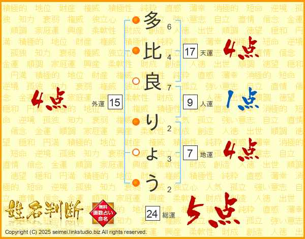 多(6画)比(4画)良(7画) り(2画)ょ(3画)う(2画)