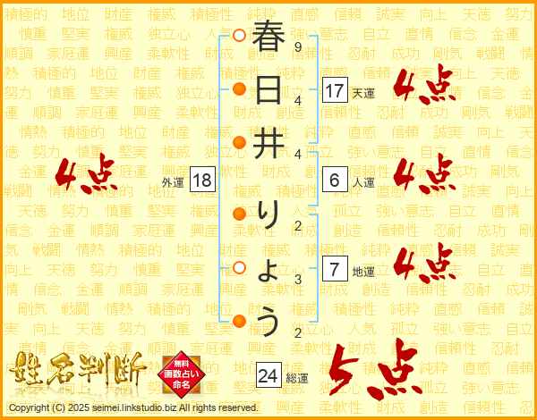 春(9画)日(4画)井(4画) り(2画)ょ(3画)う(2画)