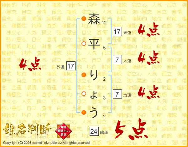 森(12画)平(5画) り(2画)ょ(3画)う(2画)