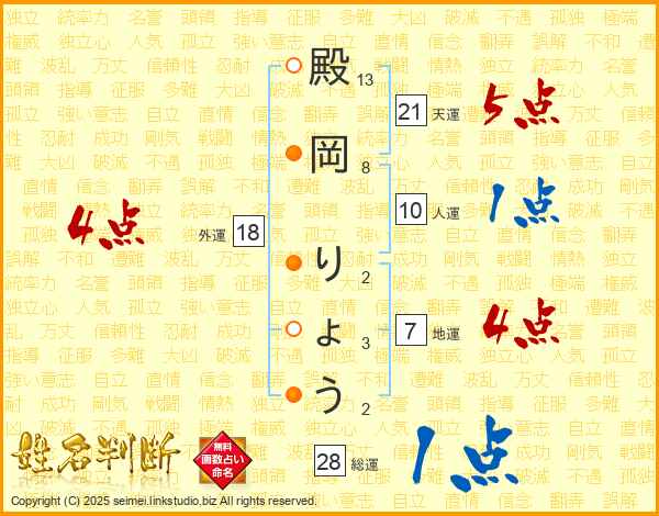 殿(13画)岡(8画) り(2画)ょ(3画)う(2画)