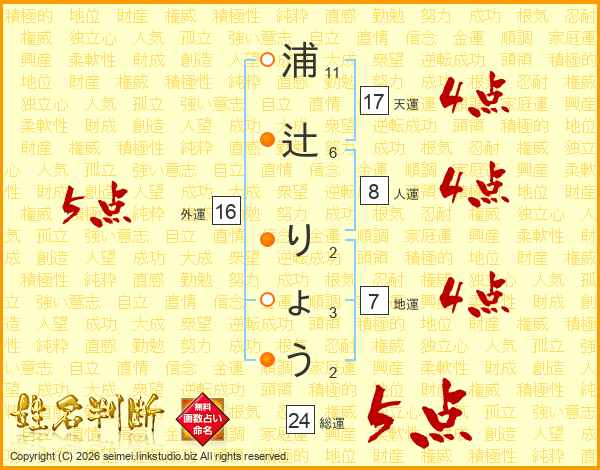 浦(11画)辻(6画) り(2画)ょ(3画)う(2画)