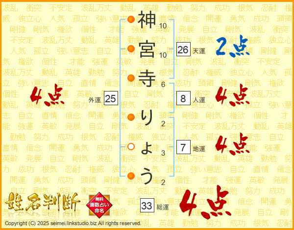 神(10画)宮(10画)寺(6画) り(2画)ょ(3画)う(2画)