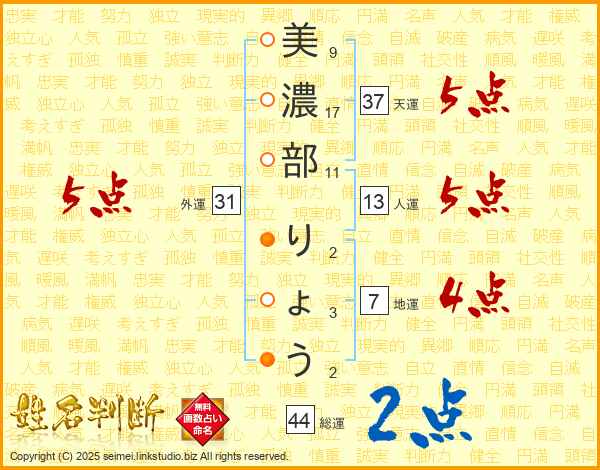 美(9画)濃(17画)部(11画) り(2画)ょ(3画)う(2画)