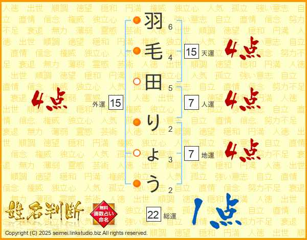 羽(6画)毛(4画)田(5画) り(2画)ょ(3画)う(2画)