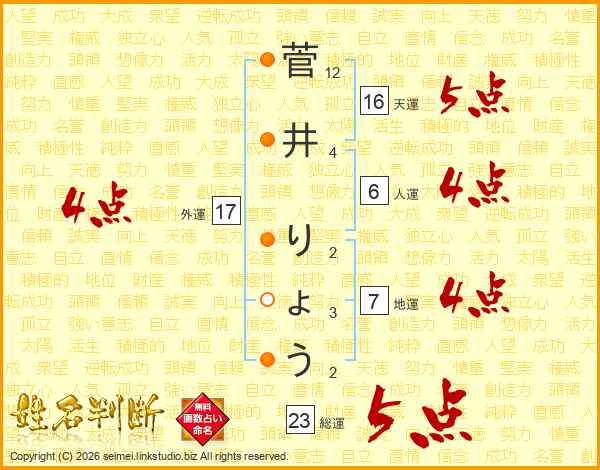 菅井りょうさんの総運は23画の5点!