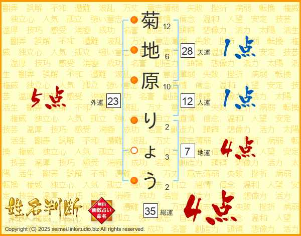 生活面を象徴する運勢です。外部から受ける影響力を表し、結婚運、家庭運や職場、環境への順応性を表します。総運から人運を引いた画数。姓や名が1文字の場合を除く。