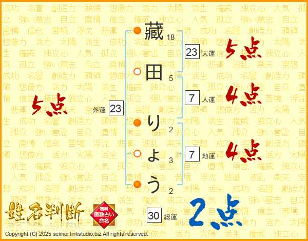 藏(18画)田(5画) り(2画)ょ(3画)う(2画)