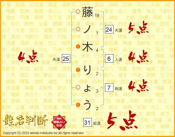 藤(19画)ノ(1画)木(4画)  り(2画)ょ(3画)う(2画)