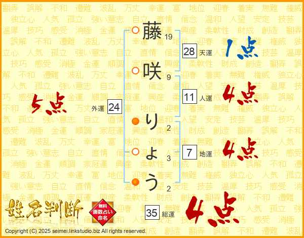 藤(19画)咲(9画) り(2画)ょ(3画)う(2画)