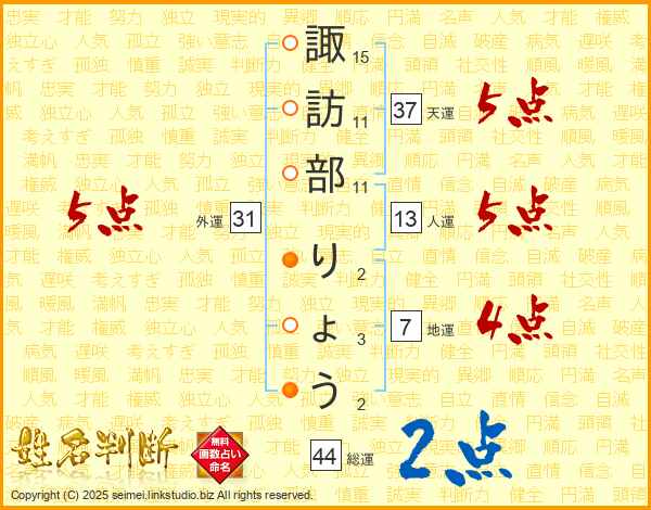 諏(15画)訪(11画)部(11画) り(2画)ょ(3画)う(2画)