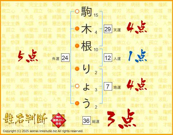 駒(15画)木(4画)根(10画) り(2画)ょ(3画)う(2画)