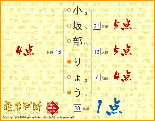 小坂部りょうさんの天運は21画の5点!