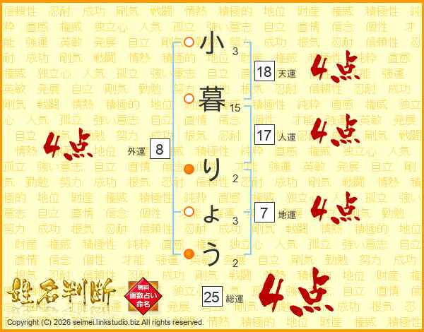 生活面を象徴する運勢です。外部から受ける影響力を表し、結婚運、家庭運や職場、環境への順応性を表します。総運から人運を引いた画数。姓や名が1文字の場合を除く。