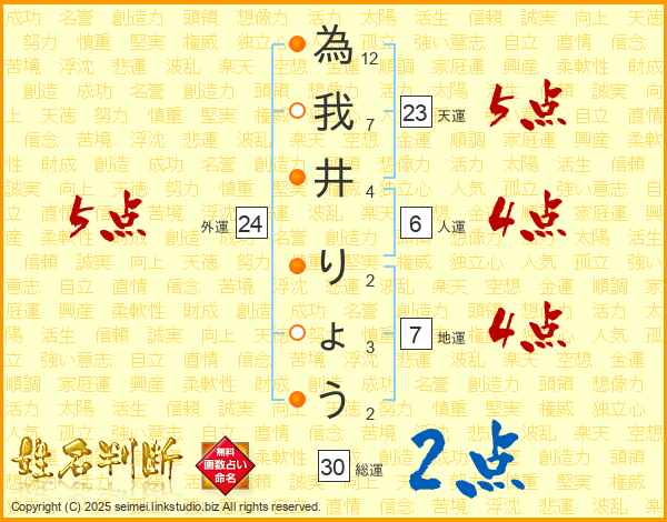 生活面を象徴する運勢です。外部から受ける影響力を表し、結婚運、家庭運や職場、環境への順応性を表します。総運から人運を引いた画数。姓や名が1文字の場合を除く。