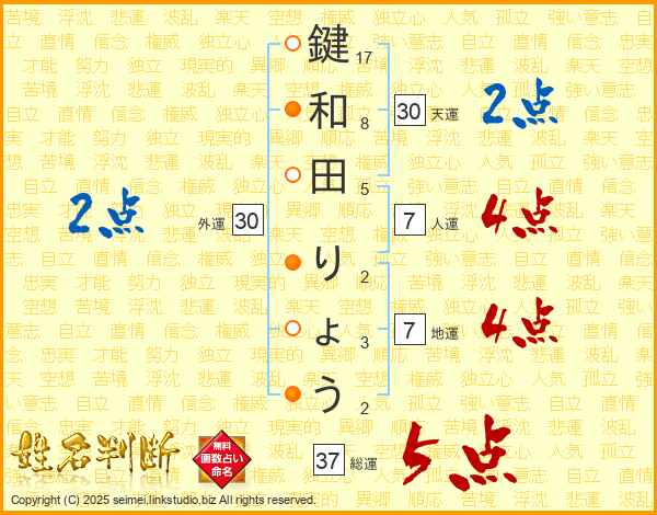 生活面を象徴する運勢です。外部から受ける影響力を表し、結婚運、家庭運や職場、環境への順応性を表します。総運から人運を引いた画数。姓や名が1文字の場合を除く。