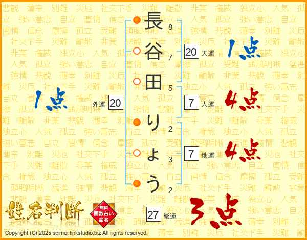 生活面を象徴する運勢です。外部から受ける影響力を表し、結婚運、家庭運や職場、環境への順応性を表します。総運から人運を引いた画数。姓や名が1文字の場合を除く。