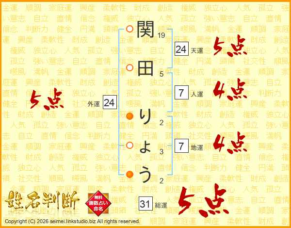関田りょうさんの総運は31画の5点!