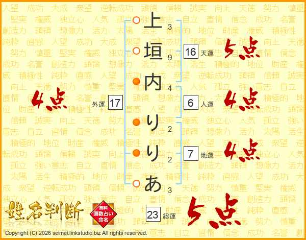 上(3画)垣(9画)内(4画) り(2画)り(2画)あ(3画)
