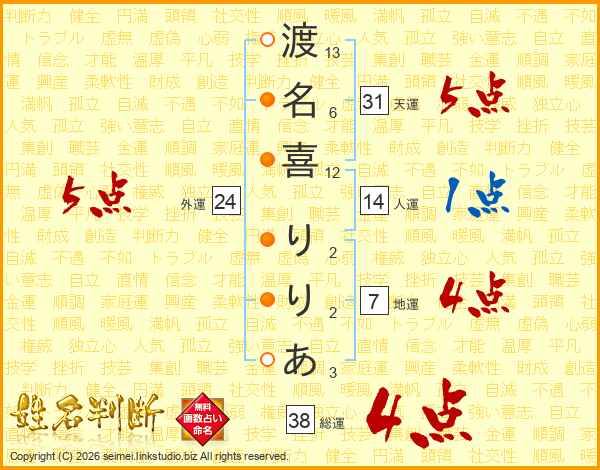 渡(13画)名(6画)喜(12画) り(2画)り(2画)あ(3画)