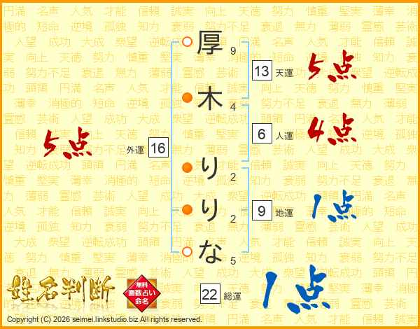 厚(9画)木(4画) り(2画)り(2画)な(5画)