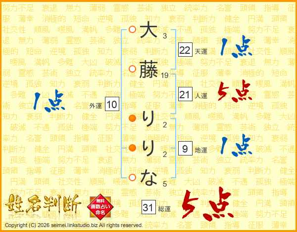生活面を象徴する運勢です。外部から受ける影響力を表し、結婚運、家庭運や職場、環境への順応性を表します。総運から人運を引いた画数。姓や名が1文字の場合を除く。