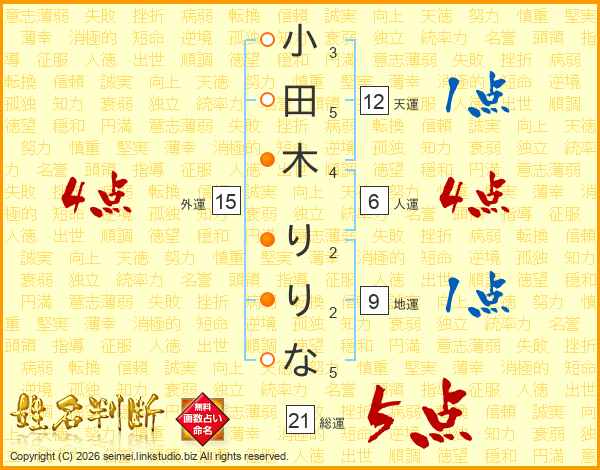 生活面を象徴する運勢です。外部から受ける影響力を表し、結婚運、家庭運や職場、環境への順応性を表します。総運から人運を引いた画数。姓や名が1文字の場合を除く。