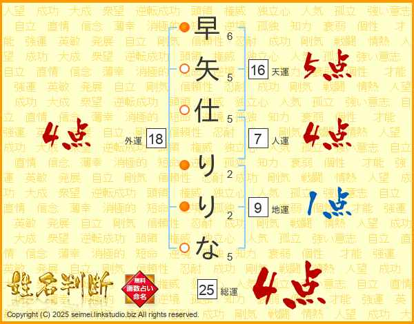 生活面を象徴する運勢です。外部から受ける影響力を表し、結婚運、家庭運や職場、環境への順応性を表します。総運から人運を引いた画数。姓や名が1文字の場合を除く。