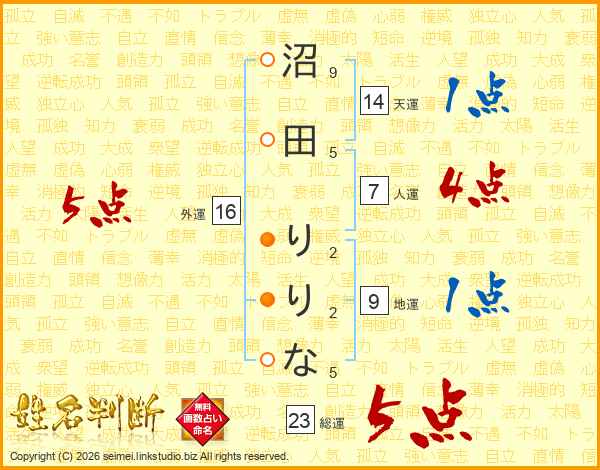 沼(9画)田(5画) り(2画)り(2画)な(5画)