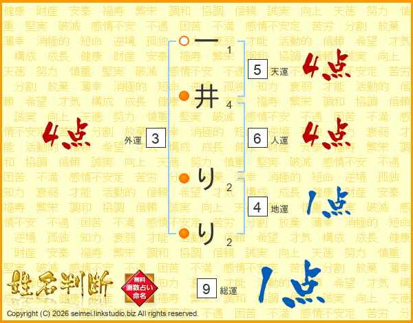 画数の奇数(○陽)と偶数(●陰)の配列で吉凶を占います。どちらかにかたよる名前は大凶名で避ける必要があります。画数の奇数偶数。