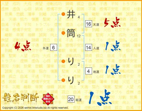 生活面を象徴する運勢です。外部から受ける影響力を表し、結婚運、家庭運や職場、環境への順応性を表します。総運から人運を引いた画数。姓や名が1文字の場合を除く。