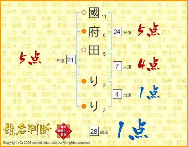 生活面を象徴する運勢です。外部から受ける影響力を表し、結婚運、家庭運や職場、環境への順応性を表します。総運から人運を引いた画数。姓や名が1文字の場合を除く。