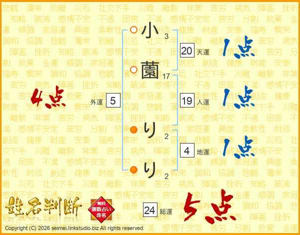 生活面を象徴する運勢です。外部から受ける影響力を表し、結婚運、家庭運や職場、環境への順応性を表します。総運から人運を引いた画数。姓や名が1文字の場合を除く。