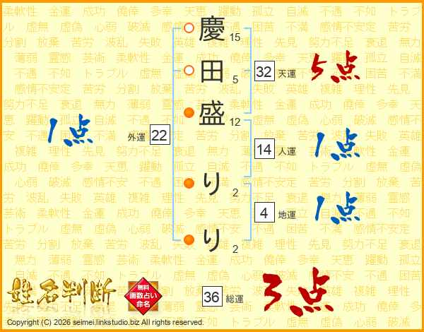 慶(15画)田(5画)盛(12画) り(2画)り(2画)