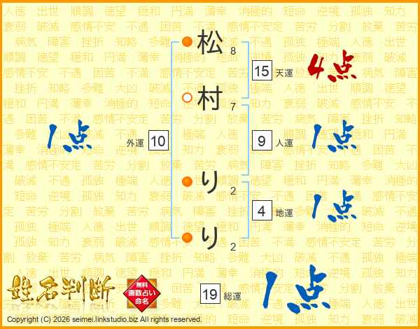 生活面を象徴する運勢です。外部から受ける影響力を表し、結婚運、家庭運や職場、環境への順応性を表します。総運から人運を引いた画数。姓や名が1文字の場合を除く。