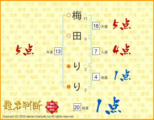 梅田りりさんの総運は20画の1点!