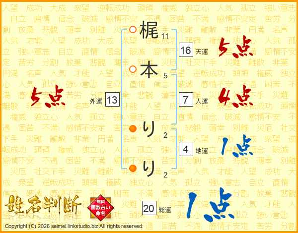 梶(11画)本(5画) り(2画)り(2画)