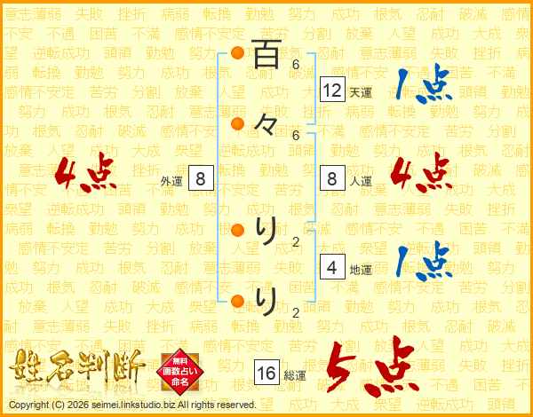 生活面を象徴する運勢です。外部から受ける影響力を表し、結婚運、家庭運や職場、環境への順応性を表します。総運から人運を引いた画数。姓や名が1文字の場合を除く。