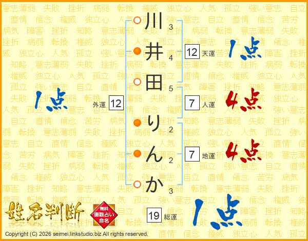 生活面を象徴する運勢です。外部から受ける影響力を表し、結婚運、家庭運や職場、環境への順応性を表します。総運から人運を引いた画数。姓や名が1文字の場合を除く。