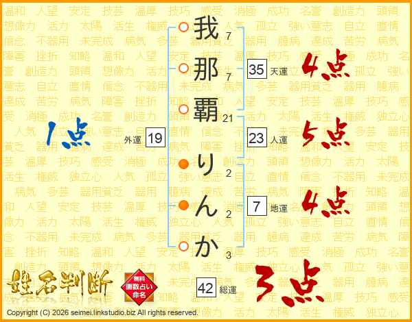 我(7画)那(7画)覇(21画) り(2画)ん(2画)か(3画)