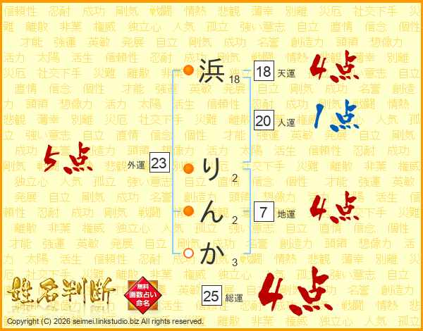 生活面を象徴する運勢です。外部から受ける影響力を表し、結婚運、家庭運や職場、環境への順応性を表します。総運から人運を引いた画数。姓や名が1文字の場合を除く。