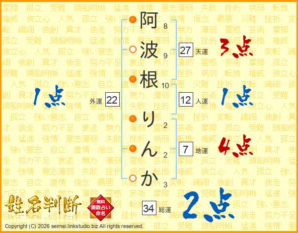 阿(8画)波(9画)根(10画) り(2画)ん(2画)か(3画)