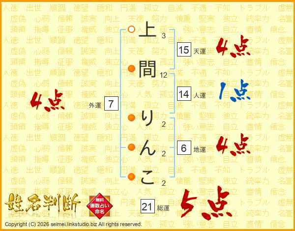 上(3画)間(12画) り(2画)ん(2画)こ(2画)