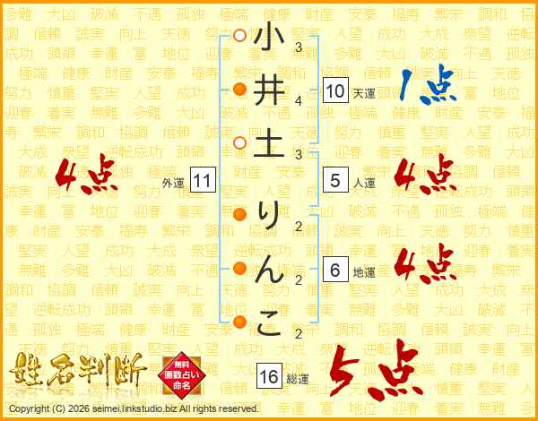生活面を象徴する運勢です。外部から受ける影響力を表し、結婚運、家庭運や職場、環境への順応性を表します。総運から人運を引いた画数。姓や名が1文字の場合を除く。