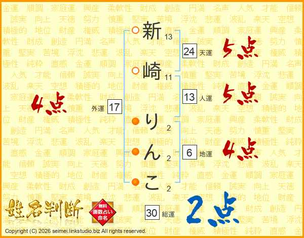 新(13画)崎(11画) り(2画)ん(2画)こ(2画)