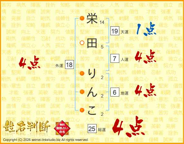 栄(14画)田(5画) り(2画)ん(2画)こ(2画)