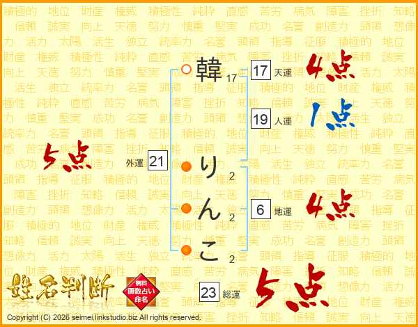 韓りんこさんの総運は23画の5点!