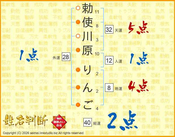 勅(11画)使(8画)川(3画)原(10画) り(2画)ん(2画)ご(4画)