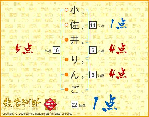 小(3画)佐(7画)井(4画) り(2画)ん(2画)ご(4画)